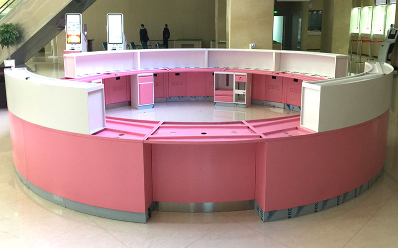 醫療家具產品設計,護士站導醫臺鑒于門診大廳頂部有圓形結構,此款服務臺的結構為方形,采用的是中國傳統建筑中